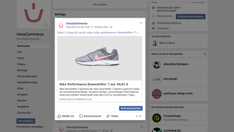 Werfen wir also einmal einen Blick auf die in Deutschland mit Abstand populärste Social Media-Plattform Facebook. Mit Stand September 2017 hat Facebook in Deutschland 31 Millionen aktive Nutzer. Wenn du User der VersaCommerce-Plattform bist, kannst du diese reichweitenstarke Arena jetzt direkt adressieren. Dafür hast du in deiner VersaCommerce Plattform für alle deine angelegten Produkte einen automatisch generierten Social Sales-Link mit allen nötigen Parametern wie Produktbeschreibung, Preis, Produktbildern und mehr. Diesen brauchst du einfach nur per Copy/Paste in deinen Beitrag kopieren. Klingt einfach? Ist es auch.